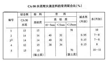 CA-50水泥耐火澆注料是不定形耐火材料中的重要品種,一般情況下常用配合比例為,CA-50水泥和耐火粉料的總用量為27%~30%,耐火骨料用量為70%-73%。CA-50水泥用量為10%~20%。當(dāng)耐火澆注料用于中高溫部位時,應(yīng)盡量減少水泥用量,同時增加耐火粉料用量,其品級應(yīng)與耐火骨料相同或高一個等級:耐火骨料應(yīng)根據(jù)窯爐使用溫度合理選擇,做到物盡其用。其顆粒級配,通常采用兩級級配,也可用統(tǒng)料,一般以砂率(即細(xì)骨料)占整個骨料的比值)為0.45~0.55來控制:水用量一般用質(zhì)量百分比表示,也可用千克每立方米或水灰比(即水于水泥和粉料之比)來表示。其總原則是,在保證澆注料拌合物的和易性情況下,應(yīng)盡量減少水用量。