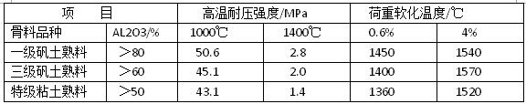 在黏土耐火澆注料中,耐火骨料起骨架作用,是其重要組成部分,占總料量的60%~70%。(下表三)為耐火骨料品種對澆注料性能的影響。表標(biāo)中看出,耐火骨料品種依AL2O3含量為據(jù),則隨AL2O3含量的增加,高溫耐壓強(qiáng)度提高,荷重軟化溫度開始點(變形0.6%)也提高,變形4%的荷重軟化溫度均大于1520℃,三級礬土熟料骨料略高些。因此,普通黏土耐火澆注料廣泛采用三級礬土熟料做耐火骨料,并取得了良好的使用效果。