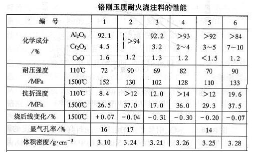 (表一)鉻剛玉質耐火澆注料的性能
