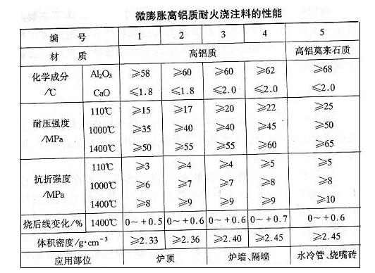 軋鋼加熱爐使用溫度低、間接操作和構造較復雜,對使用的耐火材料要求是:AL2O3含量低、強度適中、抗熱震性好和燒后線變化成微膨脹。微膨脹高鋁質耐火澆注料克服了粘土結合耐火澆注料強度低和燒后線收縮等缺點,也避免了低水泥耐火澆注料致密性高和強度大的毛病,采用二、三級礬土熟料、莫來石粉、剛玉粉、膨脹劑和燒結劑等材料,配置成微膨脹、中溫易燒結的新型耐火澆注料,其性能表見(下表)