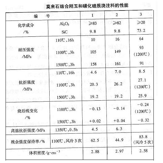 剛玉和碳化硅是配置高性能耐火澆注料的高純原料,用鋁酸鹽水泥結(jié)合劑時,帶進(jìn)有害雜質(zhì),降低其使用性能。目前,普遍采用復(fù)合結(jié)合劑配制剛玉和碳化硅質(zhì)耐火澆注料,即莫來石結(jié)合剛玉和碳化硅質(zhì)耐火澆注料,其性能見(下表)。編號1和編號2用AL2O3為98%的剛玉做耐火骨料,粒徑為8~1mm,用量為55%。SiC>98%的碳化硅作細(xì)骨料,粒徑為2~1mm,用量為10%。耐火粉料為合成莫來石粉、α-AL2O3和SiO2超微粉,其用量編號1分別為15%、14%和6%,編號2分別為10%、17.5%和7.5%,編號3用SiC>97%的碳化硅作耐火骨料,用量為65%。采用SiC>99%的碳化硅作耐火粉料,用量為10%。用AL2O3>91%的ρ-AL2O3、α-AL2O3和SiO2超微粉作結(jié)合劑和粉料,其用量為25%。耐火骨料與耐火粉料之質(zhì)量比為65:35.應(yīng)當(dāng)指出,在配合比設(shè)計時,基質(zhì)中的物料應(yīng)保證最大限度的形成莫來石高溫結(jié)合相,并能獲得良好的作業(yè)性、組織結(jié)構(gòu)和抗熱震性。同時,應(yīng)添加分散劑和防氧化劑。