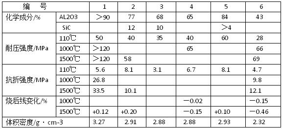 (下表)為高爐陶瓷杯和修補用自流澆注料的性能。編號1為高爐陶瓷杯用自流耐火澆注料,采用AL2O3大于98%的電熔礬土基剛玉做耐火骨料,臨界粒徑為5mm。用電熔白剛玉、α-AL2O3和SiO2超微粉作耐火粉料,CA-70水泥做結合劑并加減水劑:編號2和編號3采用AL2O3-SiC-C質自流澆注料的組成材料,前者用CA-70水泥做結合劑,后者因熱補用有機結合劑:編號4和編號5為一般窯爐自流修補料,采用三級礬土熟料、焦寶石和莫來石做耐火骨料,臨界粒徑為8mm,用剛玉粉、特礬粉、α-AL2O3和SiO2超微粉作耐火粉料,用CA-70水泥做結合劑并加減水劑:編號6為鋼包底和左轉周圍用的自流修補料,其材料組成為剛玉鎂砂尖晶石質耐火澆注料,采用超微粉做結合劑并加分散劑。
