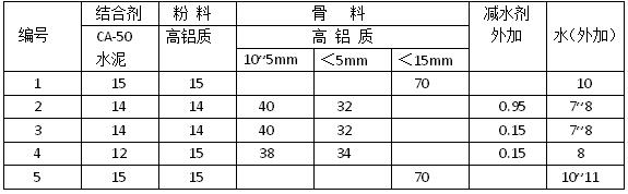 礬土水泥耐火澆注料是不定形耐火材料中的重要品種,常用配合比列于下表。表內(nèi)編號(hào)1~3所用耐火骨料和粉料是用三級(jí)礬土熟料制備的,編號(hào)4為一級(jí)礬土熟料的,編號(hào)5為一級(jí)粘土熟料的。