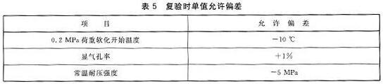 抽樣、驗收按GB/T 10325 進行。顯氣孔率、常溫耐壓強度、荷重軟化溫度為驗收檢驗項目。需要復檢時,單值允許偏差應符合表5的規定。
