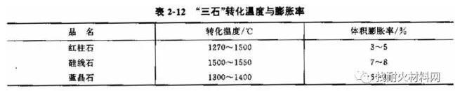 三石”包括硅線石、藍晶石、紅柱石,屬硅線石族礦物,為同質異形體。其理論組成為Al2O363.l%、SiO236.9%、化學分子式為Al2O3.SiO2或Al2SiO3。因生成條件和結構不同表現在陽離子配位上的差異,使理化性能既有共性又有差別,3種礦物原料均屬高鋁礦物,具有髙鋁礦物的性能,但其獨特性能又不為普通高鋁原料所具備^。“三石”被加熱至一定溫度不可逆的轉變為莫來石晶體(呈短柱狀、針狀的網絡結構,一般長約3微米,最長可達20微米),并析出SiO2,在加熱反應過程中,伴隨莫來石化引起體積膨脹,其中以藍晶石膨脹率為大,紅柱石居中。轉化溫度與膨脹率見表2-12。