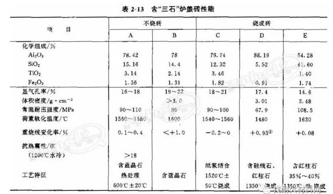 電爐蓋磚的使用實踐表明,磚的少許膨脹可以縮小磚縫,保持砌體的結構完整性,在一定程度上可以防止片狀剝落。為此在鋁硅系中引入具膨脹特性的“三石”材料是有效途徑之 一。如含藍晶石的電爐蓋磚在撫鋼、舞鋼超高功率電爐上使用,壽命在150爐以上。