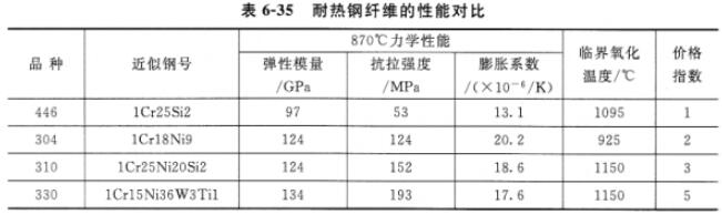 最早,鋼纖維采用冷拔、壓型、剪斷、切削等冷加工手段制得。鋼纖維不僅制造成本很高,有的還不利于纖維和基材的粘接。后來,開發了熔抽工藝。熔抽法如圖6-32所示:一組水冷鋼盤插人鋼水。鋼盤高速旋轉.將鋼水冷后甩出,形成纖紳。通過改'變鋼水溫度,冷卻強度,鍵盤的插入深度、旋轉速度、丨享度及及其他形狀特征尺寸等參數.可以控制甩出纖維長度、寬度和截面形狀。由此,可以批量生產出鋼纖維。鋼纖維成本降低、產量擴大,截面形狀和表面光潔度改善,性價比值提高,使鋼纖維增強材料得到快速推廣。耐熱鋼纖維的性能見表6-35。