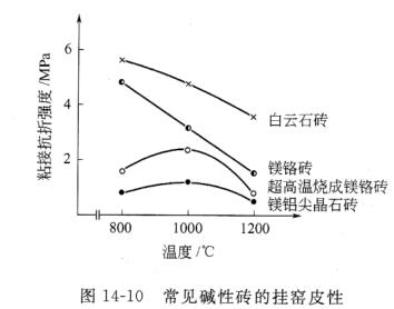 第三,水泥熟料與白云石磚的反應產物是C3S,與鎂鉻、鎂鋁耐火材料的反應產物都有C2S。C2S具有相變和粉化的可能。在Cr、AU Fe三種元素中.只 有Cr能穩定/J-C2S。所以,白云石磚的掛窯皮性最好,鎂鉻磚次之,鎂鋁磚的掛窯皮性最差。水泥熟料-耐火材料界面的粘接抗折強度如圖14-10所示。