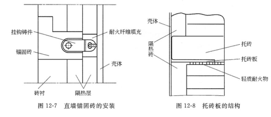 為防止預熱器直筒的襯里與殼體脫開,需要在直墻內安裝錨固件。即在殼體上裝錨固釘,錨固釘拴住埋設在墻中的錨固磚,錨固磚拉住了直墻。在直墻上, 描固磚每隔一定間距設置一組,使直墻和殼體牢固地粘接成一體。這就防止了直墻與殼體脫開,避免了發生塌落事故。錨固磚的安裝如圖12-7所示。