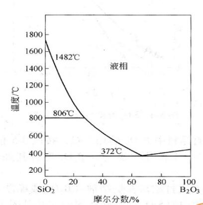 由SiO2-B2O3 二元系相圖(下圖)可知,B2O3 的熔點 為450℃,SiO2-B203系最低共熔溫度為327℃。當向SiO2中 補入不超過5%的B203時,SiO2-B2O3 混合料的熔化溫度由 SiO2熔點(1723℃)下降到1480℃.該圖還表明,以B2O3 作為石英質干式打結料的燒結劑時,在372℃就會出現液 相。