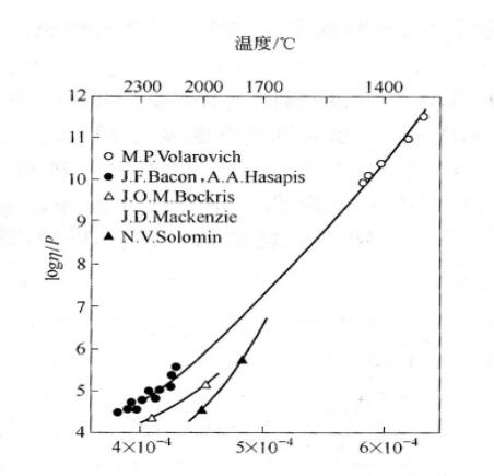 雖然B2O3 對SiO2熔化溫度的影響極為明顯,但由于石英玻 璃的黏度很大(見下圖,在1730℃時約為2xl06Pa.s),而B2O3 本身亦為玻璃網絡結構形成物,所以少量B2O3 加進SiO2材料中不會造成SiO2玻璃網絡結構產生大的破壞而影響SiO2熔 體的黏度。這表明,硅質干式打結料采用B2O3 作燒結劑時,既 能使感應爐內襯工作表面在較低溫度下燒結,又能保證在高溫 使用時工作表面為一高黏滯層。這種工作表面能阻止金屬熔體和熔渣的滲透、沖刷和侵蝕。