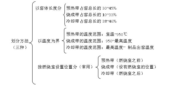 隧道窯內(nèi),裝有坯體的窯車(chē)迎著氣流連續(xù)式或間歇式運(yùn)動(dòng),一般將其分為三個(gè)帶。預(yù)熱帶、燒成帶、冷卻帶。按照三帶劃分的三種方法