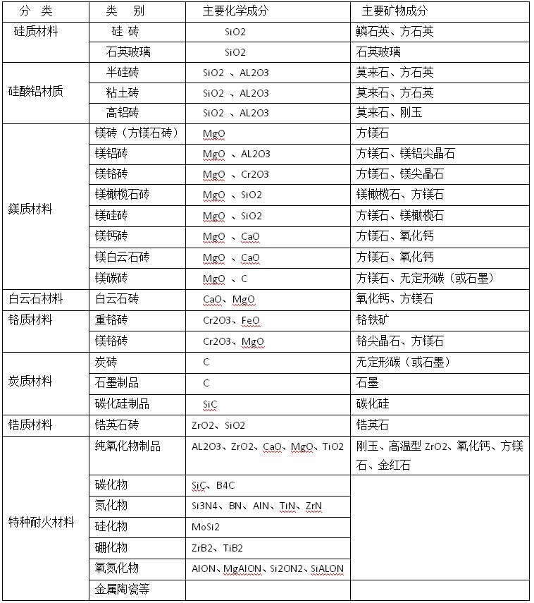 (4)按照化學礦物可分為:硅質(zhì)材料、硅酸鋁質(zhì)材料、鎂質(zhì)材料、白云石質(zhì)材料、鉻質(zhì)材料、炭質(zhì)材料、鋯質(zhì)材料、特種耐火材料。