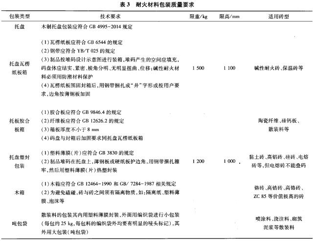 建設方與耐火材料供應方在訂立合同的時候除約定材料質量、付款方式、交貨日期等事項外,還應當包含耐火材料包裝質量要求(見表3)。合格的包裝質量及要求防雨、防潮、防震、防碰撞、防破損、防滲漏等保護措施,又要滿足堆摞要求、叉車和吊裝要求等。