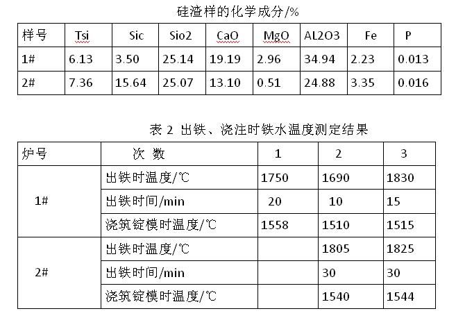 硅鐵包澆注料整體澆筑在很多的硅鐵廠任然還是空白。為此需要研制一種能滿足硅鐵包襯的耐火澆注料。首先取硅渣樣進行分析判斷其酸堿性,分析結(jié)果見表1,并對鐵水溫度進行了檢測,測定結(jié)果見表2.
