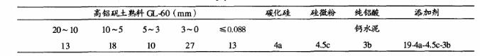 不定型耐火材料生產中,控制原材料的粒度分布是控制產品質量的關鍵工序之一。為此,根據經驗、原料性質及澆注料粒度的配比理論通過反復試驗對比,最終確定AL2O3-SiC質的鐵水包澆注料配方中,骨料:粉料(百分比=68%:32%),臨界粒度為10mm,原料粒度分為10mm、5~10mm、5~3mm、3~0mm以及≤0.088mm,具體配比如表3