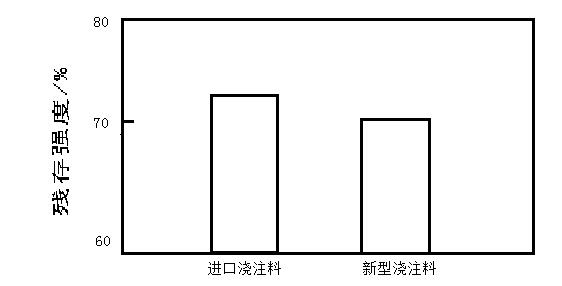 熱震穩定性能使指耐火材料抵抗溫度急劇變化而不被破壞的能力,其評價方法有水冷熱震法,殘存強度百分率等。本實驗采用殘存強度百分率來評價耐火材料熱震穩定性,研制的耐火澆注料與進口耐火澆注料的殘存強度百分率見圖1.由圖1可知,研制的新型耐火澆注料的熱震穩定性能與進口澆注料的熱震穩定性能相近。分析原因,主要是原料中骨料為優質焦寶石,基質為莫來石礦相組成。焦寶石與莫來石的熱膨脹系數不同:且莫來石為針狀結晶,相互交錯,具有良好的強度與熱震穩定性能。同時基質中添加有AL2O3,在澆注料的使用過程中,AL2O3與SiO2反應生成莫來石,莫來石的反應不僅增強了材料的強度,也改善了材料的熱震穩定性能。