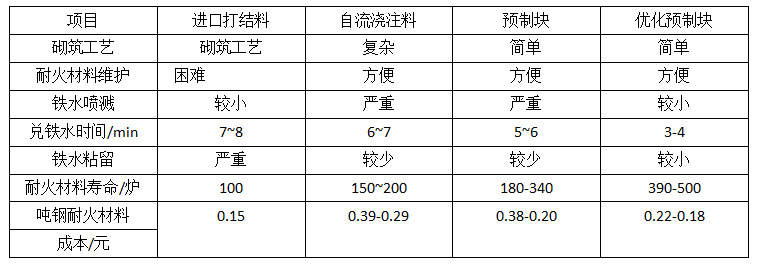 2000年3月開始,兌鐵槽耐火材料的砌筑由進口打結料改為用自流澆注料在模型內整體打結,并且拆去兌鐵槽頂蓋。由于自流澆注料整體打結后,表面平整、光滑,有效地防止了鐵水粘留,提髙了鐵水流速。但缺點是:兌鐵槽耐火材料的砌筑工藝復雜,周期較長。