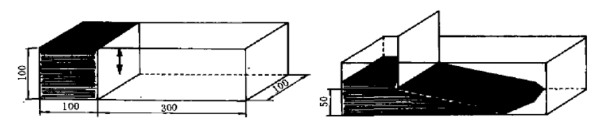 低水泥自流澆注料中水量的確定依下面的方法:將一升混合料加到如圖1所示的裝置中,將擋板提高5Omm,如果30s后混合料能夠達(dá)到對(duì)面的豎板,則此時(shí)的用水量合適。