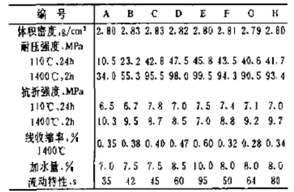 將稱好的原料預(yù)干混1〜2min,然后加水混〜5min,制成40mmX40mmX160mm的試樣,測(cè)定體積密度、耐壓強(qiáng)度和抗折強(qiáng)度。