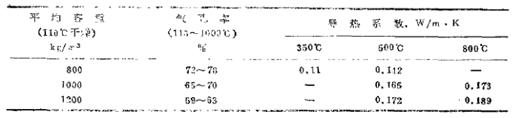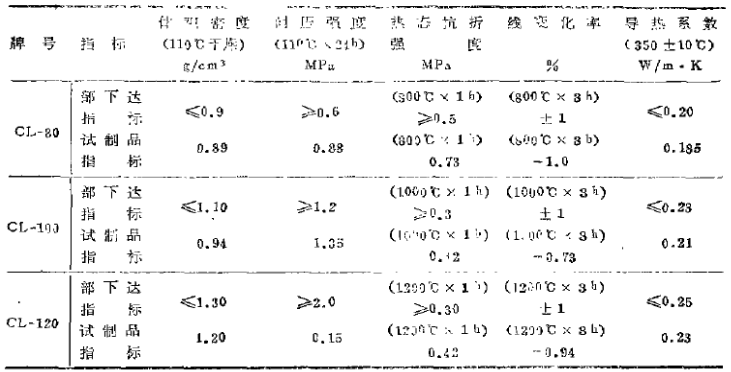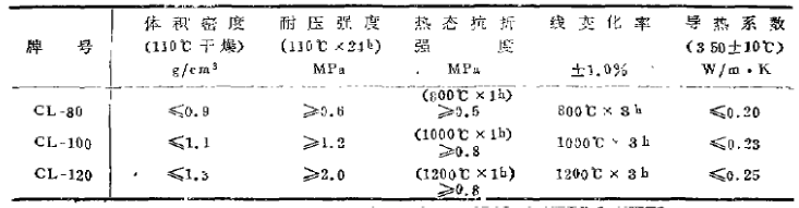日本牌號GL-80、CL-100, CL-120輕質(zhì)隔熱澆注料具有容重小,高溫下線變化率低,抗折強(qiáng)度高,導(dǎo)熱系數(shù)小等特點(diǎn),其技術(shù)指標(biāo)見表1。