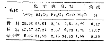在各種原料確定的基礎(chǔ)上,輕質(zhì)澆注枓的強(qiáng)度是隨結(jié)合劑標(biāo)號和用量的增加而提高的。但標(biāo)號過高或用量過多不僅容重大,水化熱高,線收縮大,而且也不經(jīng)濟(jì)。為此選用500#礬土水泥作為結(jié)含劑,其化學(xué)成分見表2。