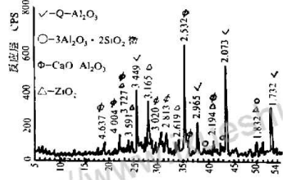 3.2 巖相分析,電鏡分析,X-射線分析如圖3-5所示,反應層變化較大,在該層發現了新的礦物相高熔點化合物CA6,同時發現β-Al2O3、α-Al2O3及極少量霞石。除了霞石對試磚產生有害影響外,前二者對水泥熟料進一步浸蝕磚面,與磚產生化學反應,強固粘結磚面均有阻礙作用。