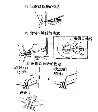 如圖3所示,以往更換袖磚作業是①鉆孔去除殘留的袖磚;②新袖磚插入出鋼口固定;③用瀝青系燒灼村枓固定袖磚。但是此瀝青系燒灼材料很難流入新袖磚與出銅口座磚之間的縫隙,因而填充不充分的情況時有發生,需要長財間的靜止才能固定,這是以往村料存在的問題。用流動性能好、固定時間短的特殊噴吹材料代替以往的材料,可以使袖磚在出鋼口座磚得到穩定的固定狀態,并能縮短因固定所需的靜止時間。另一方面在操作時沒有煙,改善了作業環境。
