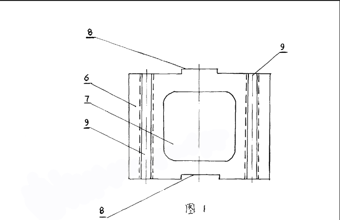 圖1、2中,6—專用異型耐火磚的整體,7-異型磚整體6上的中心通孔,8—異型磚整體6外側(cè)面的凹槽、凸起,9—異型磚整體6上、下表面的凹槽、凸起。本實(shí)例在使用時(shí)可由數(shù)個(gè)專用異型磚的整休6通過(guò)其外側(cè)面的凹糟、凸起8相亙咬合物成導(dǎo)風(fēng) 墻4 (附圖3中)的一層,再由若干專用異型磚的整體6通過(guò)其上、下表面的凹槽、凸起相互4合砌成導(dǎo)風(fēng)墻4 (附圖3中)的若干層,這樣就徹筑成有數(shù)個(gè)導(dǎo)風(fēng)孔的堅(jiān)爐導(dǎo)風(fēng)墻。