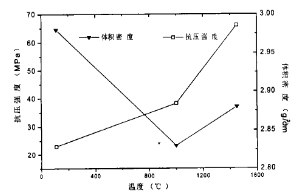 圖1 自流澆注料在不同溫度下的抗壓強(qiáng)度與體積密度變化