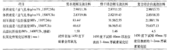 研制的鐵溝澆注料采用剛玉、碳化硅、硅微粉、氧化鋁微粉、碳素材料為基本成分,加入輔助的結(jié)合劑、硬化劑及性能調(diào)整劑;澆注成型,110度干燥后,在1450度燒結(jié)3小時(shí),測(cè)定試樣的性能,指標(biāo)如表1。