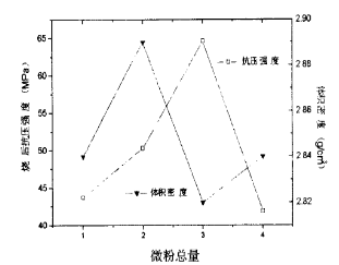 對(duì)于微粉的加入量,自流澆注料也有一個(gè)最佳指標(biāo),如圖2所示,微粉含量過低,強(qiáng)度與密度都不高,超過一定的值后,微粉含量增加,強(qiáng)度下降,體積密度增加。從體積密度和抗壓強(qiáng)度的角度綜合考慮,微粉含量需要保持在一個(gè)合適的范圍。