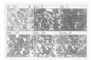 對(duì)于快干澆注料,1450度燒后基質(zhì)間的成分面分布如圖5所示,基質(zhì)中的鈣含量相對(duì)低一些,結(jié)合相仍然以鋁硅酸鈣為主,結(jié)合相的熔點(diǎn)不太高,由于采用了輔助結(jié)合劑,其燒結(jié)后的熔點(diǎn)不太高,由于采用了輔助結(jié)合劑,其燒結(jié)后的結(jié)構(gòu)相對(duì)比較致密,抗侵蝕與抗氧化性能較好。