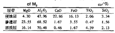 選取M5抗渣試驗后的樣塊進行微觀分析。圖2為M5抗渣各層帶的SEM照片。對侵蝕層發育完整的針狀晶體進行微區分析,其化學組成(質量分數,%)為:Al2O3 74.92,CaO 21.18,FeO 3.90,屬CaO-Al2O3系化合物;在侵蝕層與滲透層交界面有一層厚度約0.5mm的致密層,其各組分的質量分數(%)為:MgO 1.21、Al2O3 80.60、CaO 8.91、SiO2 1.34、FeO 5.48,其A/C≈10(CA6中A/C=10.9),應該是CA6;在滲透層里,主晶相為尖晶石(約占80%),還有少量的CA6晶體相互交錯,結構比較致密;在原質層里,主晶相為尖晶石,粒徑相對較小,晶粒互相連接,但整體結構較疏松。由圖1可知,隨鎂砂細粉加入量增加,試樣的抗渣性隨之下降,從鎂砂細粉加入量為5a開始,渣滲透明顯增加。這主要是由于Fe2O3固溶于鎂砂中,使得熱面與澆注料內部存在一定的Fe2O3濃度差,更促進了渣的滲透;另外,從1600℃,3h燒后顯氣孔率的結果可知,抗渣性隨鎂砂細粉含量增加而降低的又一原因是由于在燒成后顯氣孔率的增加。表5示出了侵蝕層、滲透層及原質層的EDAX面分析結果,可見渣中的CaO、FeO向材料內部侵入,CaO與Al2O3反應生成針狀和條柱狀的CA6,使滲透層的結構致密,FeO被尖晶石大量吸收而形成(Mg·Fe)O·Al2O3復合尖晶石,從而抑制了FeO的進一步滲透。