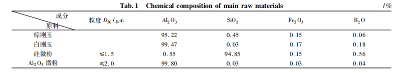 試驗原料有:電熔棕剛玉,白剛玉,97碳化硅,硅微粉(粒度分析D50<1.5um)、球瀝青(軟化點(diǎn)約為110℃)、高鋁水泥、98金屬硅粉(w(Si)=98.24%),活性Al2O3微粉(粒度分析D50<2um),碳化硼(w(B4C)=95.7%,粒度為325目),六偏磷酸鈉,其主要原料化學(xué)組成見表1。