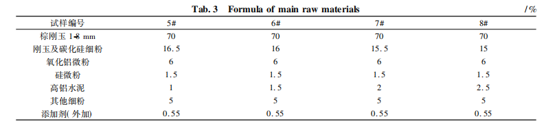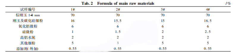 實(shí)驗中首先調(diào)整硅微粉加入量,加入質(zhì)量分?jǐn)?shù)分別為1%、1.5%、2%、2.5%,差值用剛玉粉彌補(bǔ),試樣配比見表2。