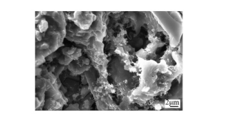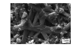 通過選擇高強(qiáng)純鋁酸鈣水泥和高效減水劑等大量實(shí)驗,硅微粉1.5%和水泥1.5%組合時,常溫強(qiáng)度可達(dá)到50MPa以上,1450℃高溫冷態(tài)耐壓強(qiáng)度約90MPa,1450℃高溫抗折強(qiáng)度5MPa以上,對其熱態(tài)抗折強(qiáng)度試樣斷口進(jìn)行電鏡分析:基質(zhì)結(jié)構(gòu)與晶相組成,與傳統(tǒng)配方相比,如圖3,發(fā)現(xiàn)試樣中形成發(fā)育良好的莫來石晶相,如圖4,從而顯著提高了試樣的熱態(tài)抗折強(qiáng)度。