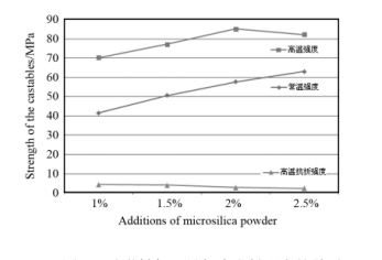 圖1 硅微粉加入量與澆注料強(qiáng)度的關(guān)系