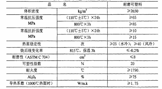 耐磨可塑料是由高鋁礬土熟料、剛玉和碳化硅等耐磨原料為骨料,以鋁酸鹽水泥為粘結劑,外摻若干添加劑配制而成的,高溫下耐磨性能優良的耐火澆注料,以澆筑或振動搗打方式成型的材料。保定工程所采用的耐磨可塑料的主要性能指標見表1。可塑料烘爐溫度控制曲線見圖2。