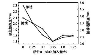 圖5示出了澆注料的抗渣性能與活性α—Al2O3添加量的關系?梢钥闯觯S著配料中活性α—Al2O3添加量的增加,澆注料的侵蝕深度與滲透深度在開始階段不斷下降,但當活性α—Al2O3加入量超過一定量后,澆注料的抗渣性與上面分析的強度相一致,與組織結構密切相關。澆注料的機構越致密,結構缺陷減少,則其抗渣性能也越好。