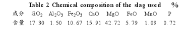 將不同粒級的原料及分散劑按設計的比例放入攪拌鍋內干攪拌30s,再加入適量水攪拌2~3min。將攪拌好的料置于振動流動度測量儀中測定其流動值。然后將試樣制成40mm×40mm×160mm的條形樣,用于測定試樣經110℃4h、1000℃3h、1600℃3h熱處理后的強度?乖囼灢捎渺o態坩堝法,試樣為70.7mm×70.7mm×70.7mm的立方法,坩堝內孔為32mm×40mm,自然養護24h后脫模,再在烘箱內于110℃干燥24h。在干燥后的抗渣試樣中加入70g爐渣(組成見表2),于1600℃3h條件下進行抗渣試驗,冷卻后用切割機沿坩堝軸線將其切開,分析坩堝試樣侵蝕和滲透的程度,并進行巖相分析。