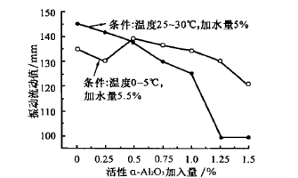 從圖3可以看出;在施工環境溫度較高的環境下,活性α—Al2O3加入量對浸漬管澆注料施工性能的影響比較顯著,活性α—Al2O3加入量對澆注料施工性能的影響比較顯著,活性α-Al2O3加入量越多,澆注料的振動流動值越小,當活性α—Al2O3的加入量超過一定量后,澆注料的流動性能將會全部喪失;而在較低環境溫度下施工時,活性α—Al2O3加入量對澆注料振動值流動值影響較小,并且有波折。這是因為α—Al2O3d活性大,比表面積高,與水接觸是生生如下反應;