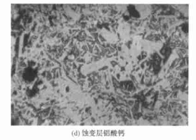 圖6為抗渣試驗后試樣的顯微結構照片。可以看出:試樣原質層與顆粒的分布比較均勻,但存在一定數量的氣孔(見圖6(a)黑色部分),爐渣正是通過這些氣孔不斷向澆注料的內部滲透的;由于爐渣中存在大量CaO、Fe2O3等低熔物,這些低熔物滲透進入試樣后與基質中的α—Al2O3反應形成鐵鋁酸四鈣及鋁酸鈣等低熔點相,如圖6(b)和圖6(c)所示:隨著反應的進行,這種低熔點相不斷向爐渣中熔出,導致試樣的蝕變層主要以針狀的鋁酸鹽為主,如圖6(b)所示。若能提高澆注料的致密度,減少其結構缺陷,則能有效地提高澆注料的抗渣性能。