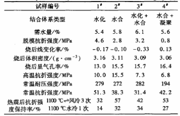 比較發(fā)現(xiàn),在這4種不同結(jié)合體系的試樣中,采用水化結(jié)合體系的1#試樣的需水量相對(duì)較低,燒后顯氣孔率低,脫模強(qiáng)度和燒后常溫及高溫強(qiáng)度較高;而采用水合結(jié)合體系的2#試樣的高溫強(qiáng)度和抗熱震性明顯優(yōu)于其他試樣,但其脫模強(qiáng)度較低。綜合考慮,選擇水化結(jié)合作為本研究的結(jié)合體系。