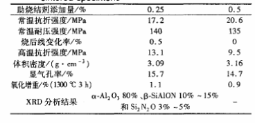 氮化燒成后試樣按相應(yīng)標(biāo)準(zhǔn)測(cè)試各種物理性能,其中高溫抗折強(qiáng)度測(cè)試條件為1400℃保溫0.5h。
