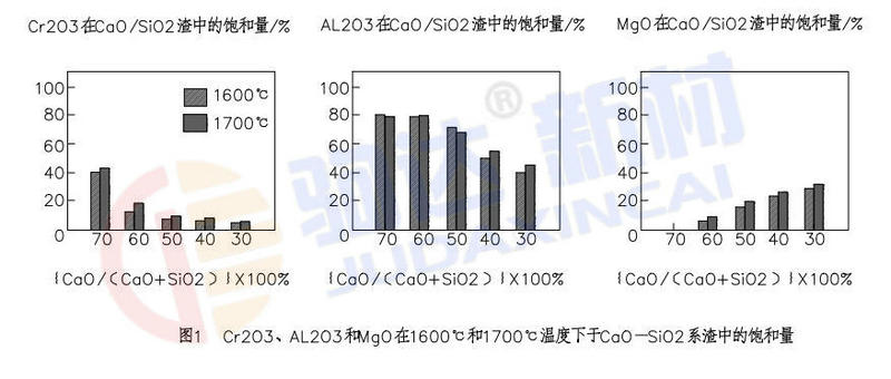 圖1示出了于1600℃和1700℃溫度下Cr2O3、AL2O3及MgO在CaO—SiO2系渣中的飽和量,它是根據CaO—SiO2—Cr2O3系、CaO—SiO2—AL2O3系和CaO—SiO2—MgO系相平衡狀態圖求出的。