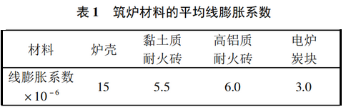 為方便比較,以爐底 Ф10000 mm 的爐底,爐底炭素層厚度1400 mm,炭塊400mm×400mm×1200 mm,膨脹縫50mm△LC = 0.2%,爐底溫度1200 ℃為探討依據(jù)。各種材料的0~1200 ℃平均線膨脹系數(shù)見(jiàn)表 1。
