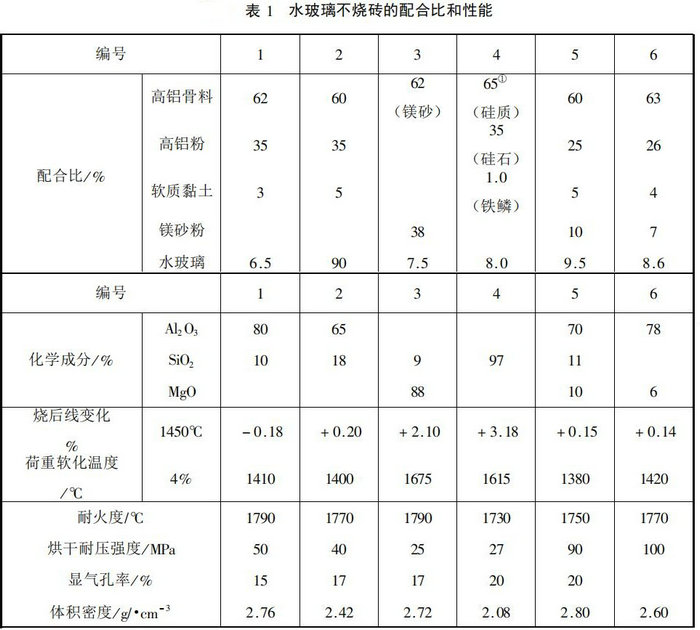 水玻璃不燒磚的使用部位不同,其配合比和性能也不同。現(xiàn)將歸納后的水玻璃不燒磚配合比和性能,列于表1。編號1~3的耐火骨料臨界粒徑分別為6mm,8mm種 10mm,其余的為5mm;水玻璃模數(shù)為2.4~3.0,密度為1.38~1.50g/cm³在壓磚機上成型后,進(jìn)行烘干,溫度約為100℃,干燥時間不少于48h。回轉(zhuǎn)窯窯襯磚,有時烘至600℃。烘干的不燒磚,其含水率小于1%。
