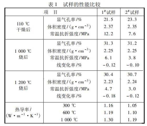 加水?dāng)嚢钑r(shí)發(fā)現(xiàn),1# 澆注料的需水量( w) 為 12%,比2#澆注料的13%稍低。經(jīng)攪拌、成型后,兩種澆注料分別在110 ℃ 24 h、1000 ℃ 3 h 和1200 ℃3 h 熱處理,然后檢測其性能,結(jié)果見表 1。可以看出: 與 2# 試樣相比,1# 試樣 110 ℃ 干燥后的顯氣孔率較低,體積密度和常溫抗折強(qiáng)度較大; 1 000、1 200 ℃燒后,兩種試樣的顯氣孔率和體積密度相似,而1# 試樣的常溫抗折強(qiáng)度,燒后線收縮率和熱導(dǎo)率( 300、600 以及 1 000 ℃ ) 均比2#試樣的高。