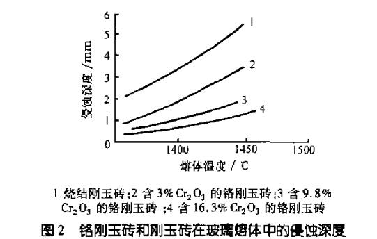 圖2示出了不同Cr203含量的鉻剛玉磚與剛玉磚被玻璃熔渣侵蝕的深度。試驗(yàn)表明:Cr203含量17%時(shí),磚中Cr203含量愈高,玻璃熔渣侵入的深度愈淺。